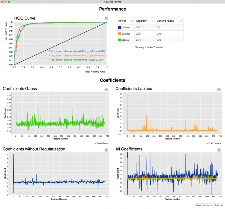 Figure 2. This is the view from the last wrapped metanode from the workflow reported in figure 1. The upper part of the view shows the performance measures for the different priors. We see that all three performance measures increase if regularization is used. In the lower part the coefficients for the different priors are plotted over the feature numbers. The plots show the different impact of Gauss and Laplace prior on the coefficients and that regularization in general leads to smaller coefficients.