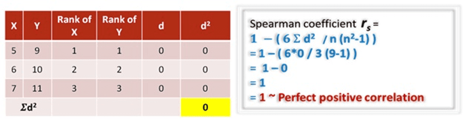 Let’s compute the Spearman’s Rank Correlation coefficient between two ranked variables X and Y that will illustrate a positive correlation:
